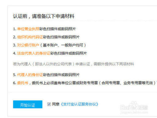 然后會提示你需要準備什么資料。如圖所示,需要營業執照,組織機構代碼,對公銀行賬戶,法人身份證等。如果不是法人開店還需要:代理人身份證,委托書。