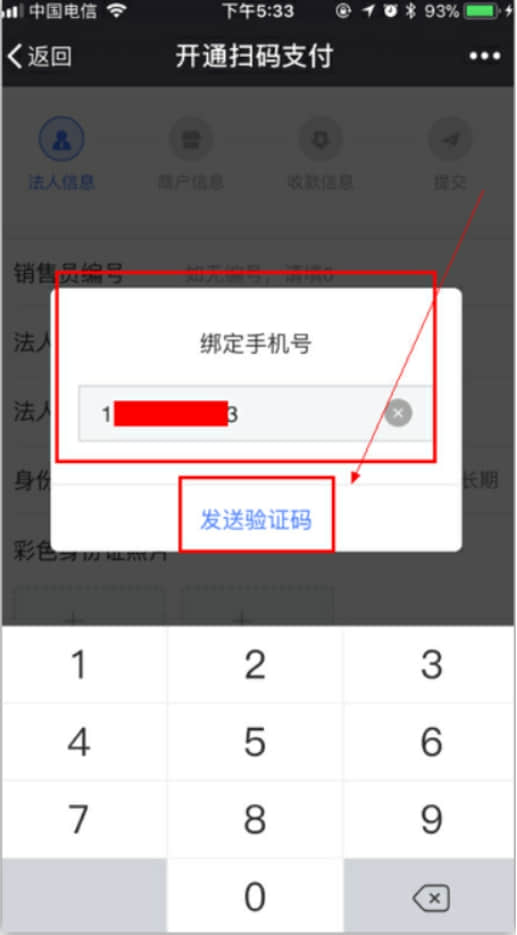 5、輸入手機號碼》》》發送驗證碼》》》輸入驗證碼建議填寫商戶老板或者負責人的手機號。