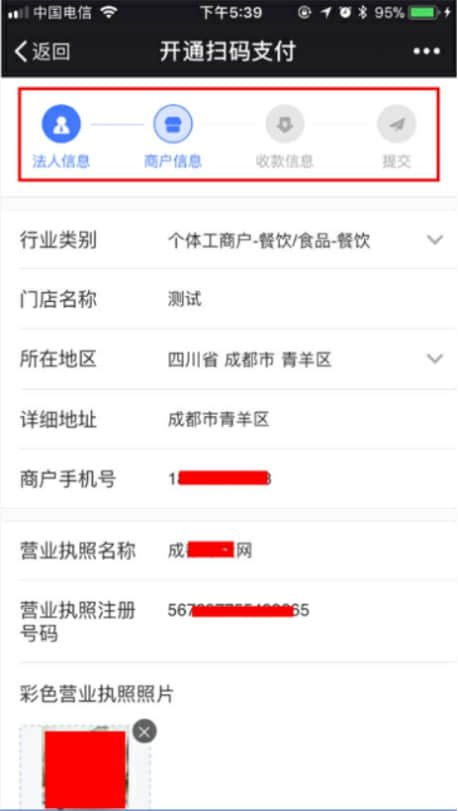6、根據要求填寫對應的 法人信息商戶信息收款信息,填寫完成后點擊提交。
